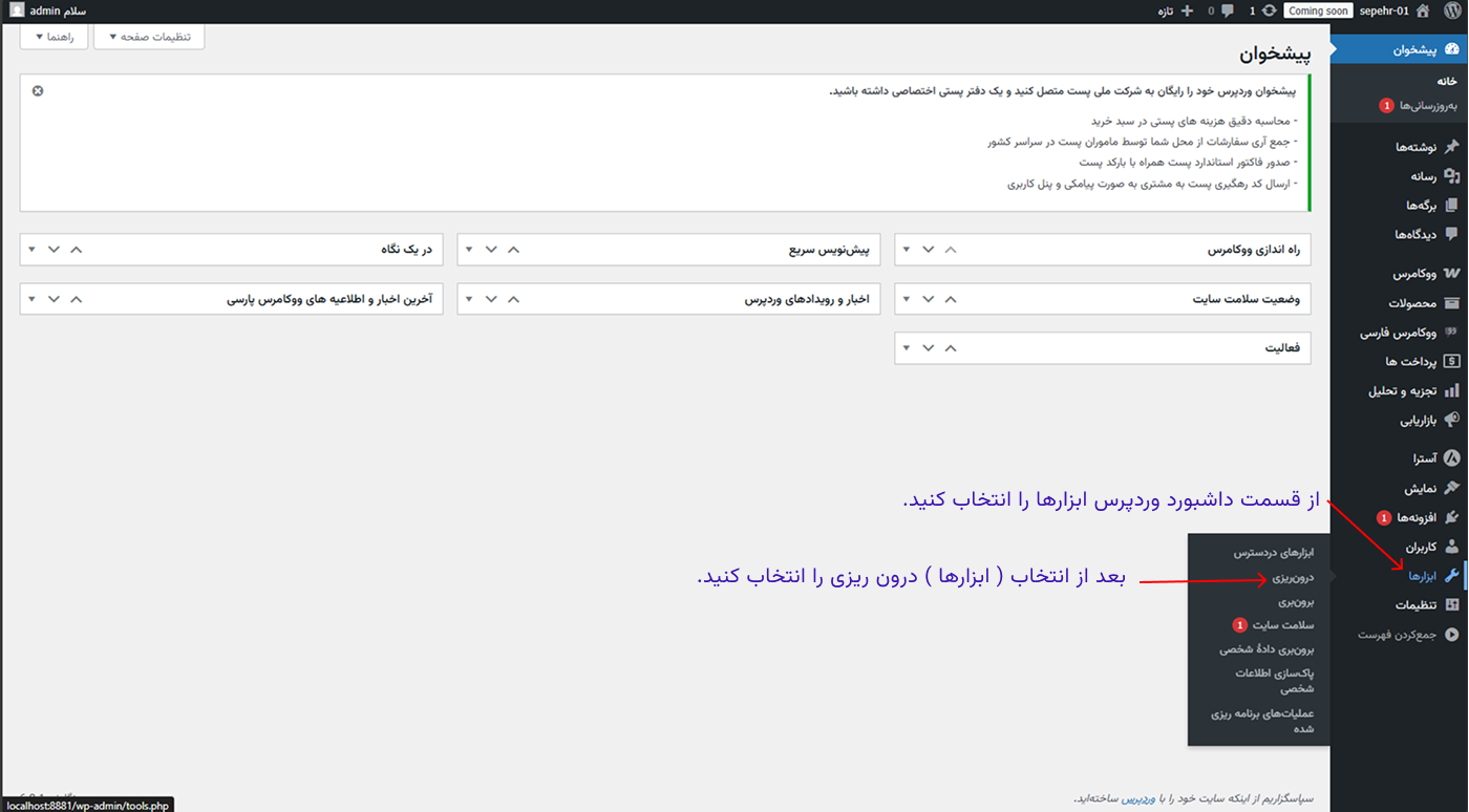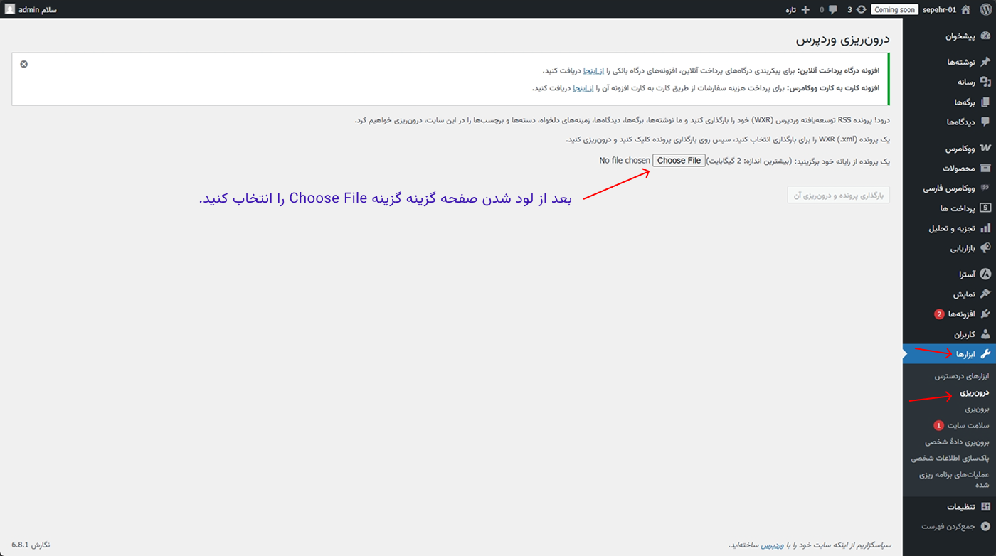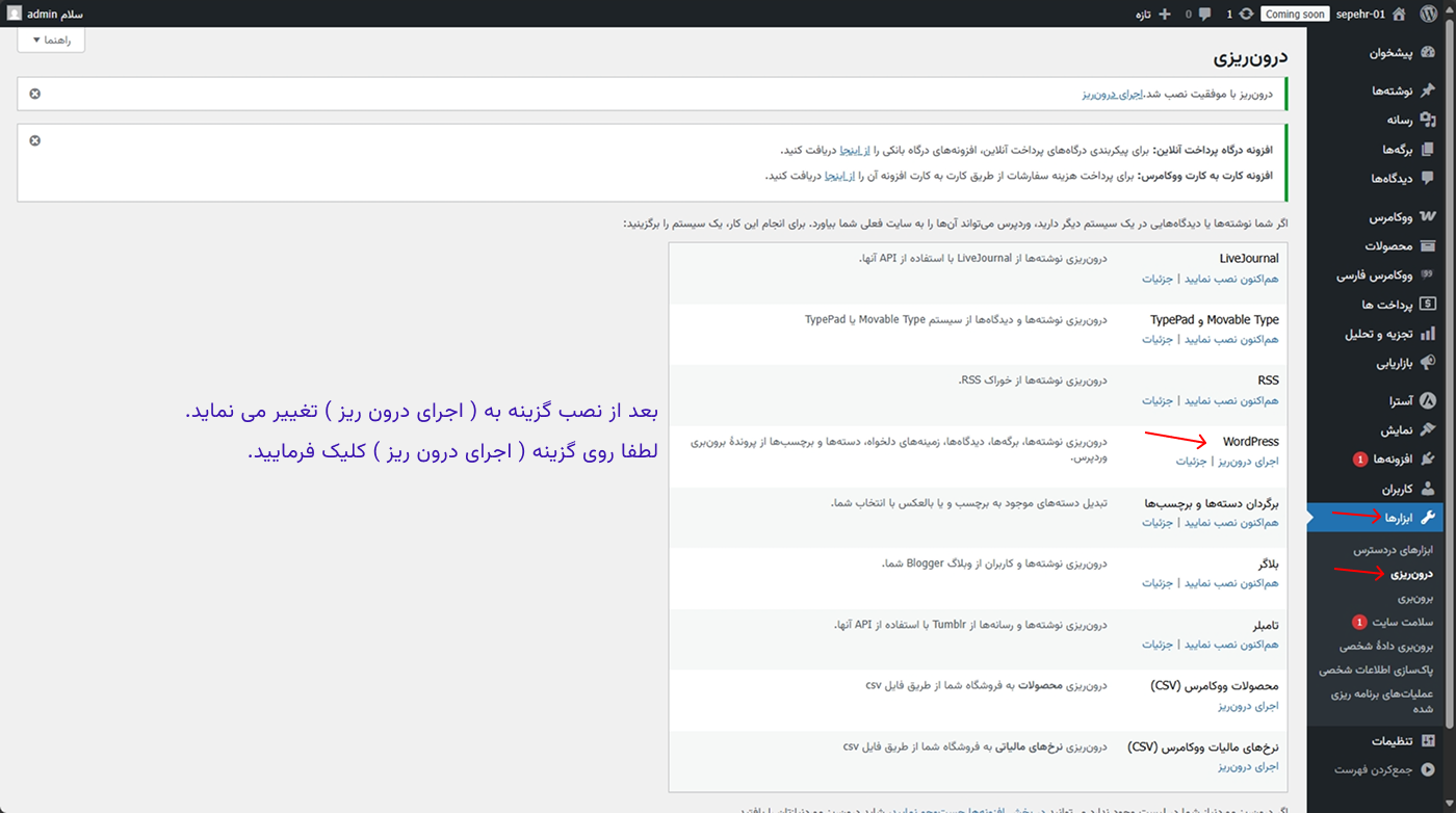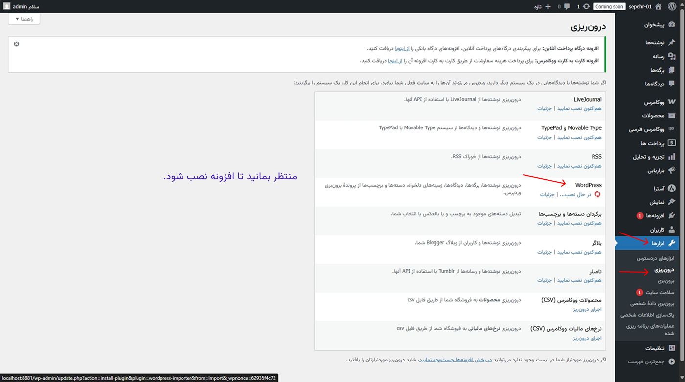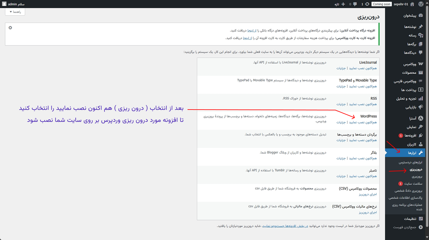 جهت نصب افزونه از منو سمت راست موس را بر روی گزینه ( ابزار ها ) برده ، در منو باز شده گزینه ( درون ریزی ) را انتخاب کنید.