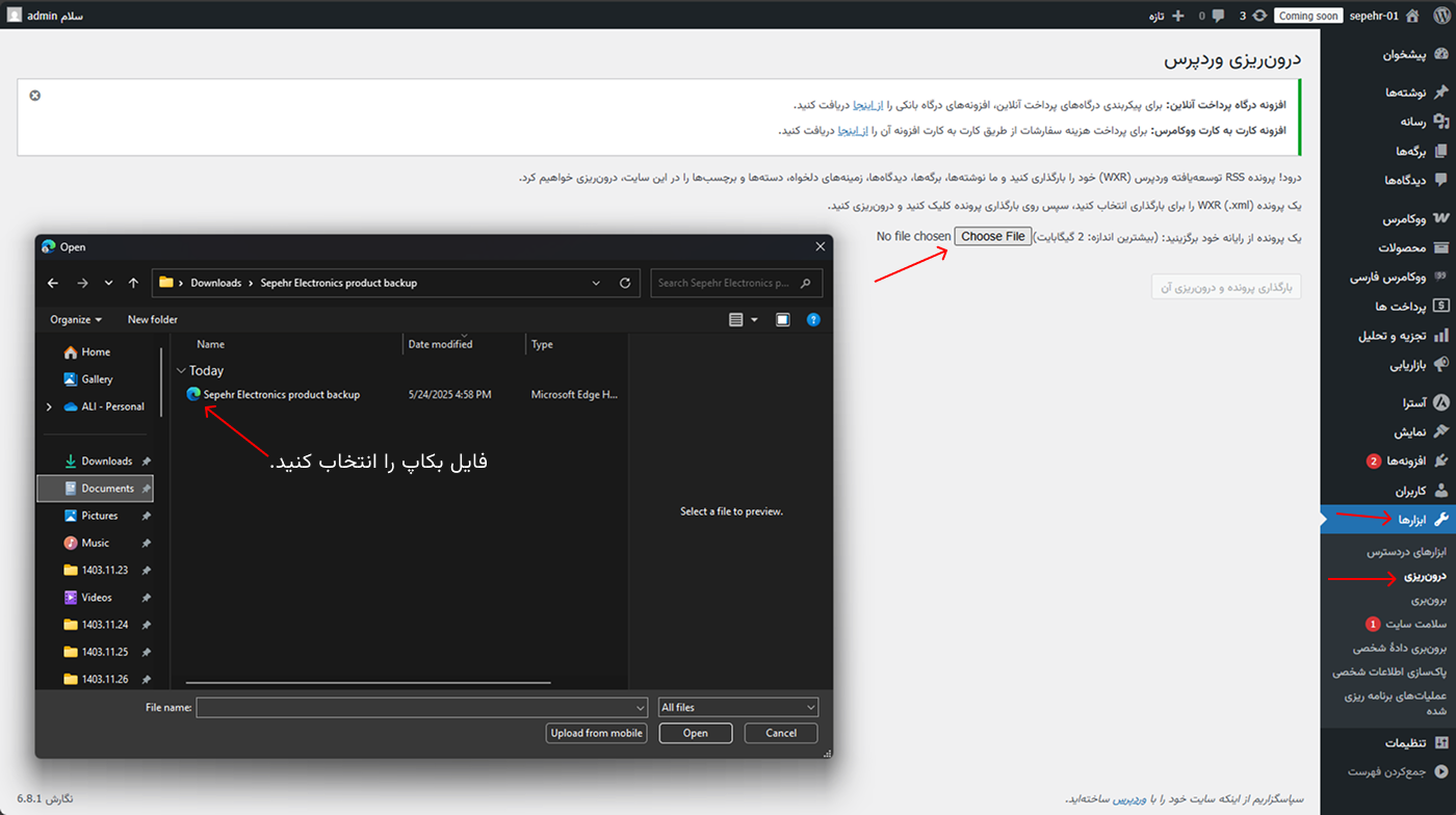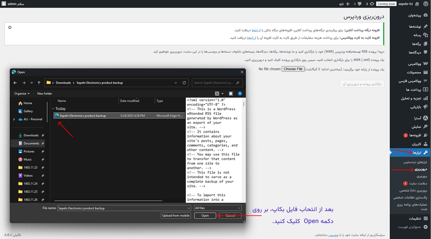 بر روی فایل بکاپ Sepehr Electronic Product backup کلیک کنید.