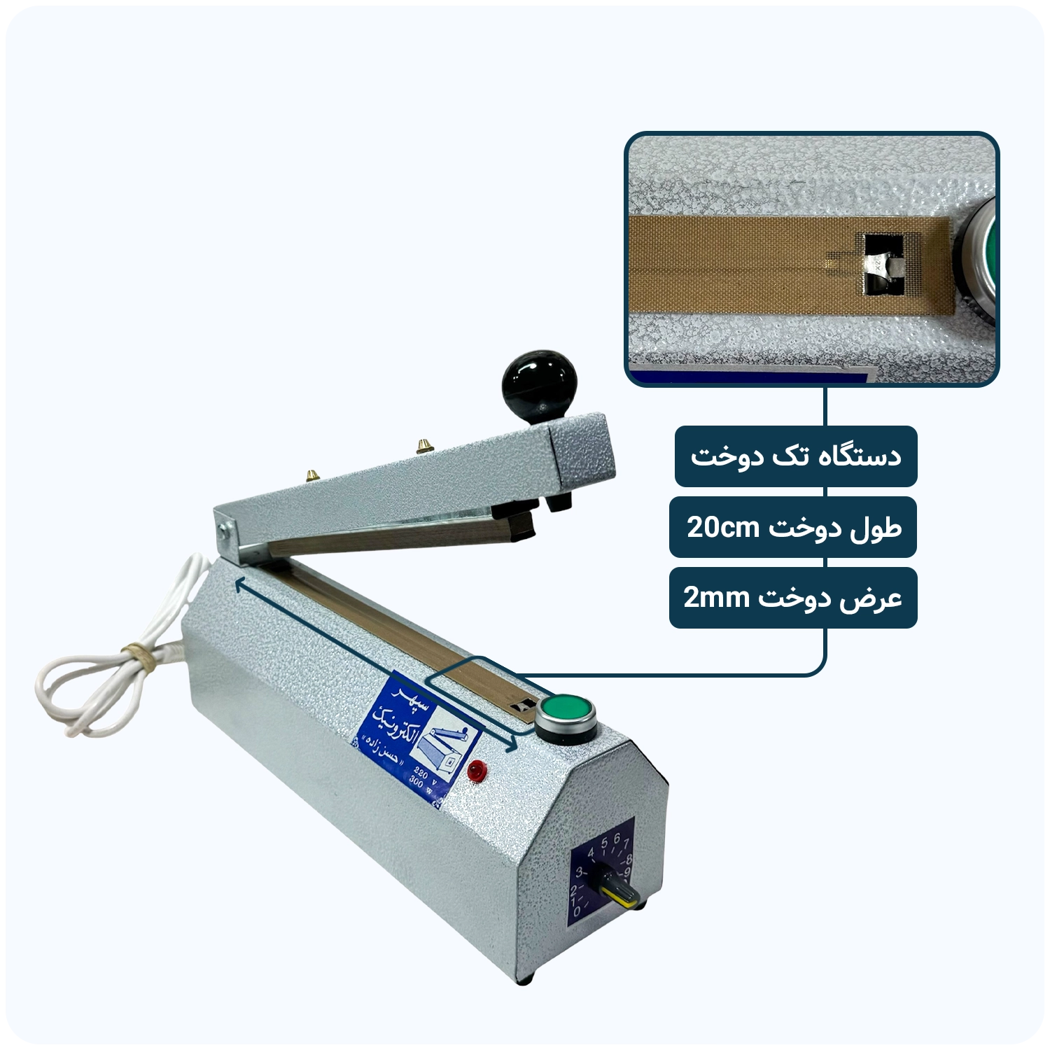 دستگاه پرس تک دوخت با طول 20 سانتی متر و عرض دوخت 2 میلی متر، ابزاری کاربردی برای بسته بندی انواع نایلون، پلاستیک و سلفون است. این دستگاه با مکانیزم حرارتی، عمل دوخت را انجام می دهد و برای مصارف خانگی، صنعتی و کارگاهی مناسب می باشد.