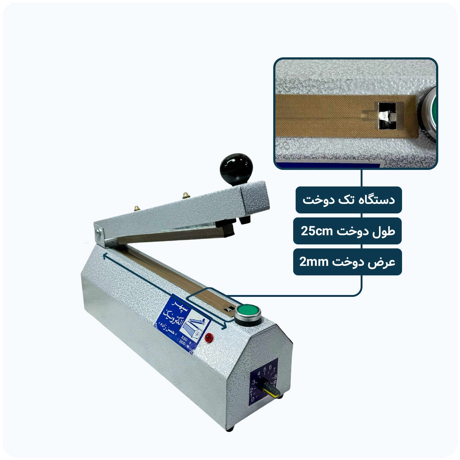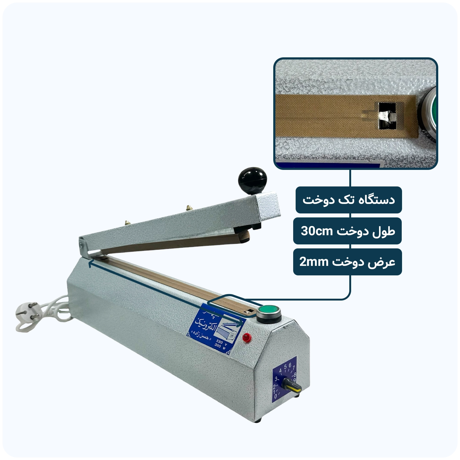 دستگاه پرس تک دوخت با طول 30 سانتی‌متر و عرض دوخت 2 میلی‌متر، ابزاری ایده‌آل برای بسته‌بندی سریع و آسان انواع نایلون، پلاستیک و سلفون است. این دستگاه با طراحی ساده و کاربری آسان، برای مصارف خانگی و صنعتی کوچک مناسب می‌باشد.