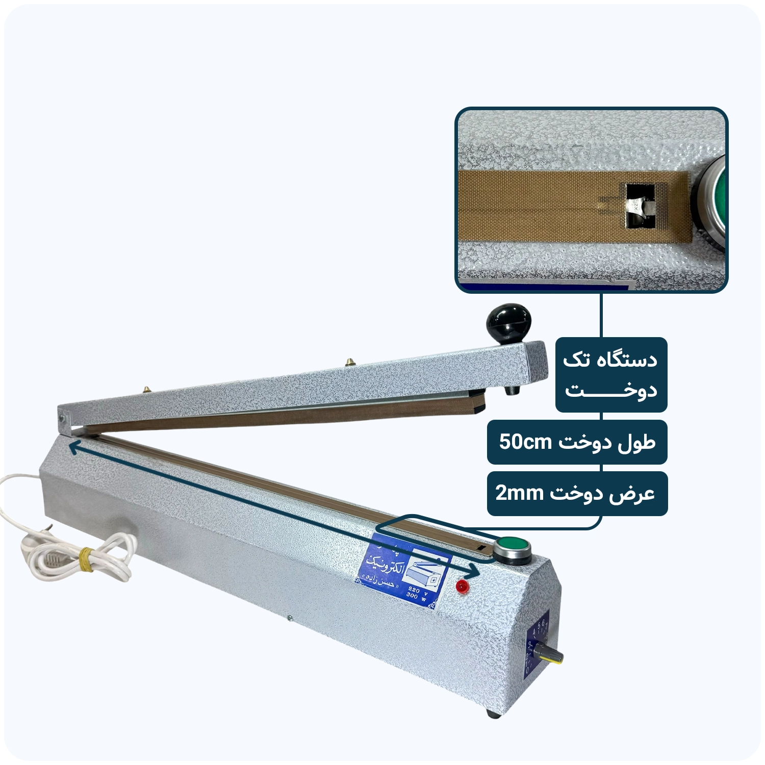 دستگاه پرس تک دوخت / طول 50cm / عرض دوخت 2mm ،ابزاری پرکاربرد برای بسته بندی و پلمپ انواع نایلون، پلاستیک و سلفون است. این دستگاه با ایجاد حرارت و فشار، لبه های نایلون را به هم چسبانده و بسته بندی محکمی را ایجاد می کند.
